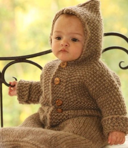 kahverengi örgü kapşonlu bebek tulumu