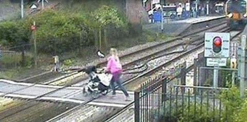 tren gelirken karşıdan karşıya geçmeye çalışan tren yolundaki anne ve çocuğu