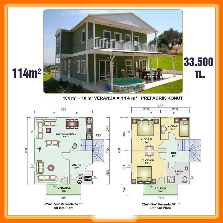 çift katlı 114 metre prefabrik ev